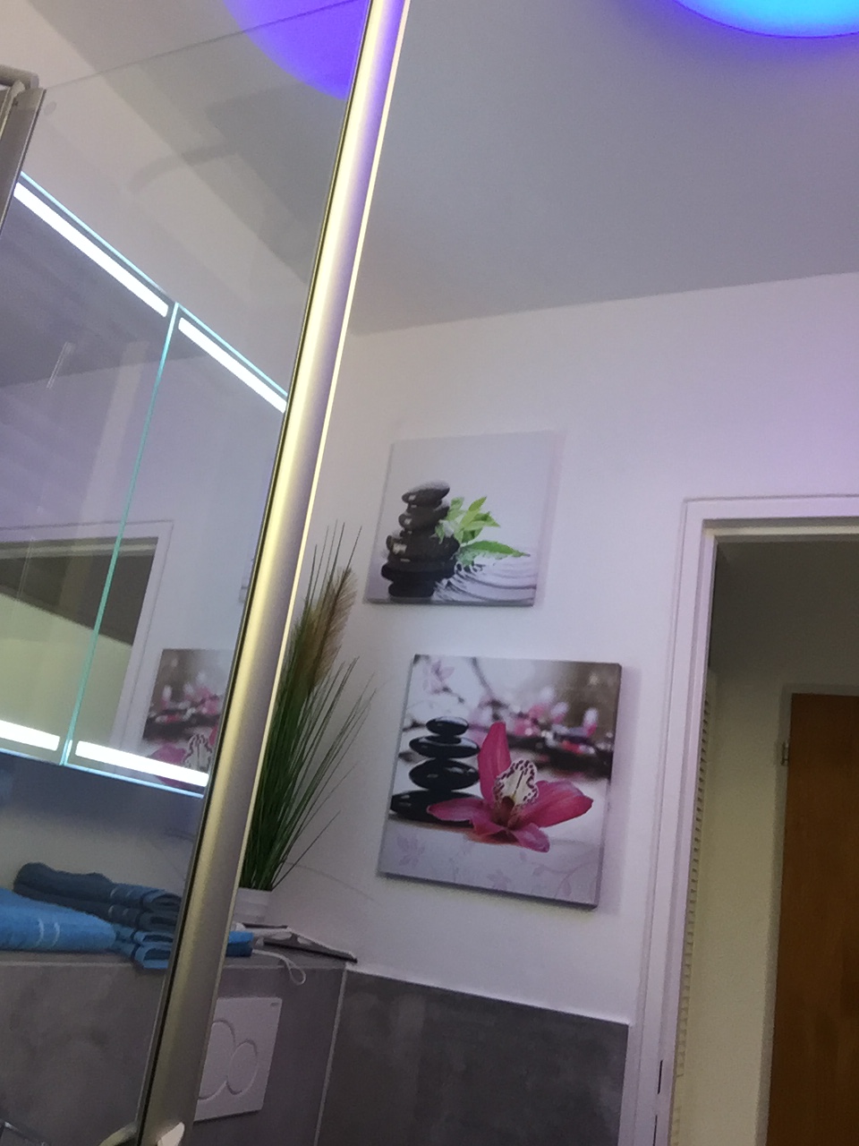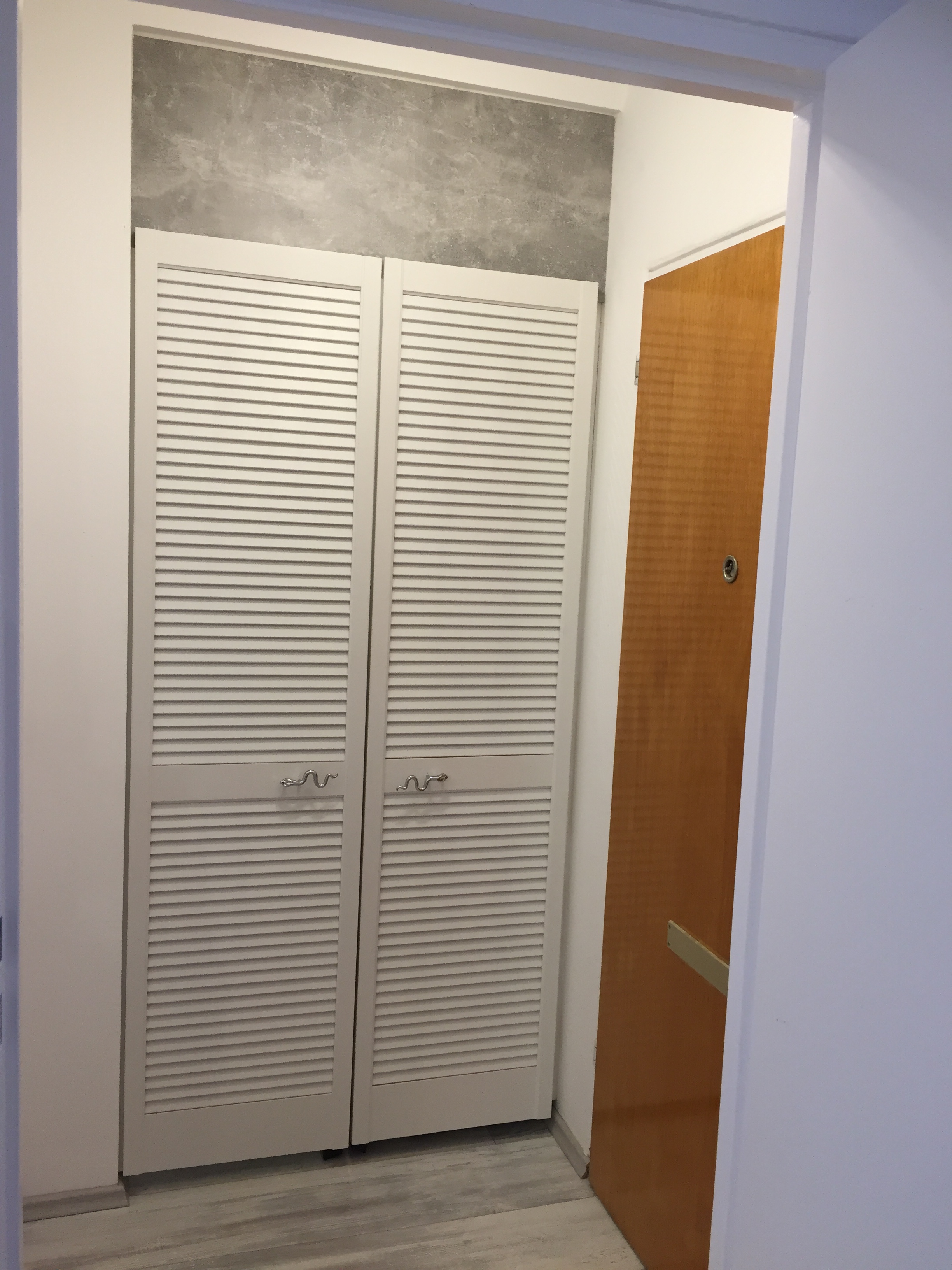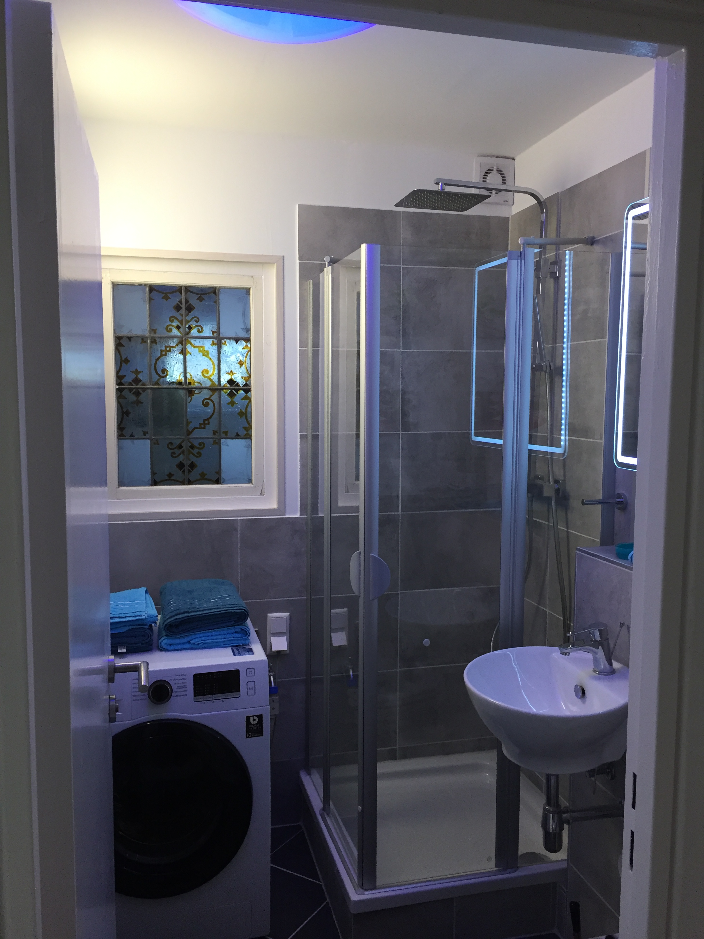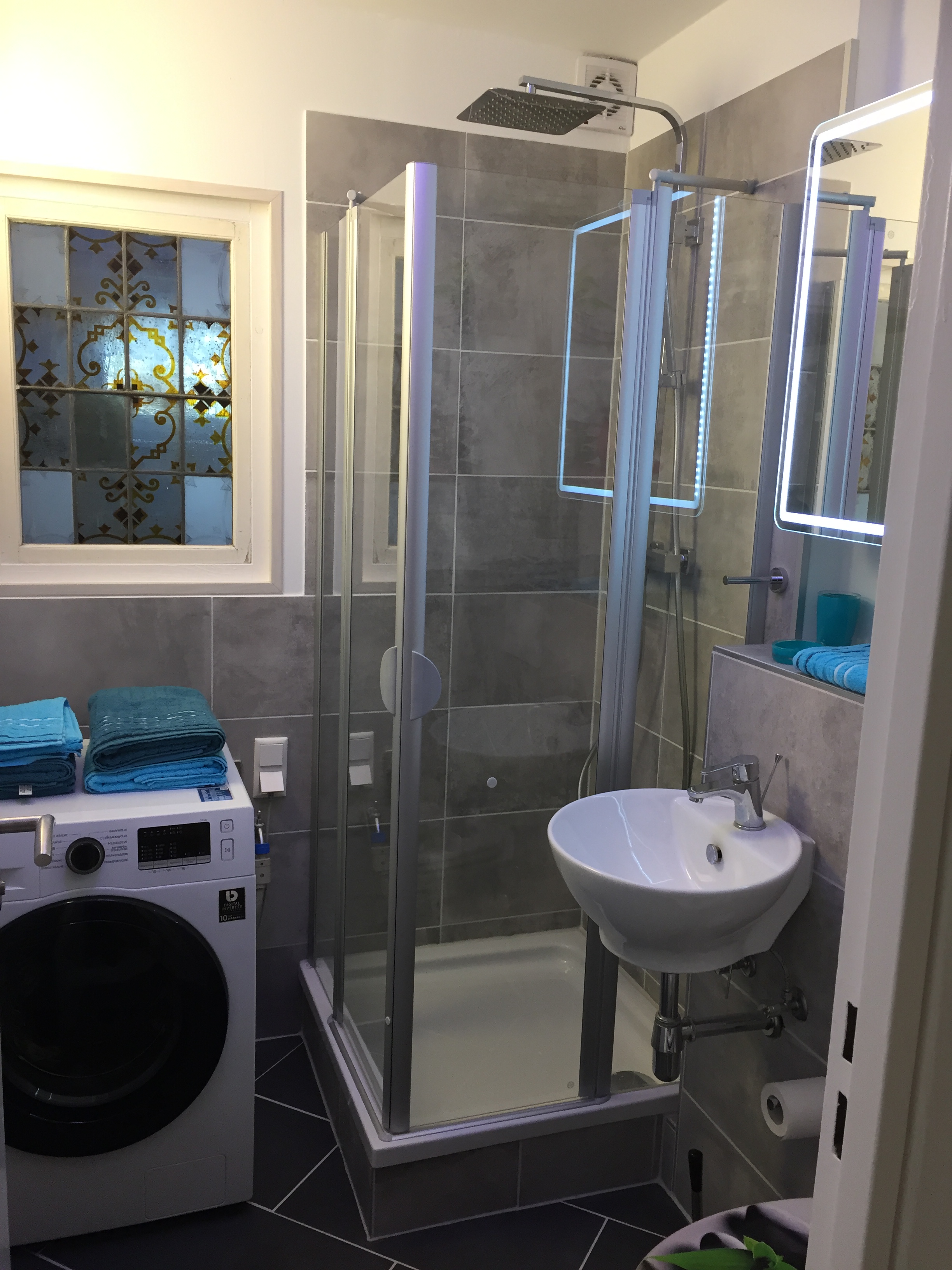 Flur mit Einbauschrank, Safe,Duschbad, Glasduschabtrennung, Waschbecken, WC, Spiegelschrank,