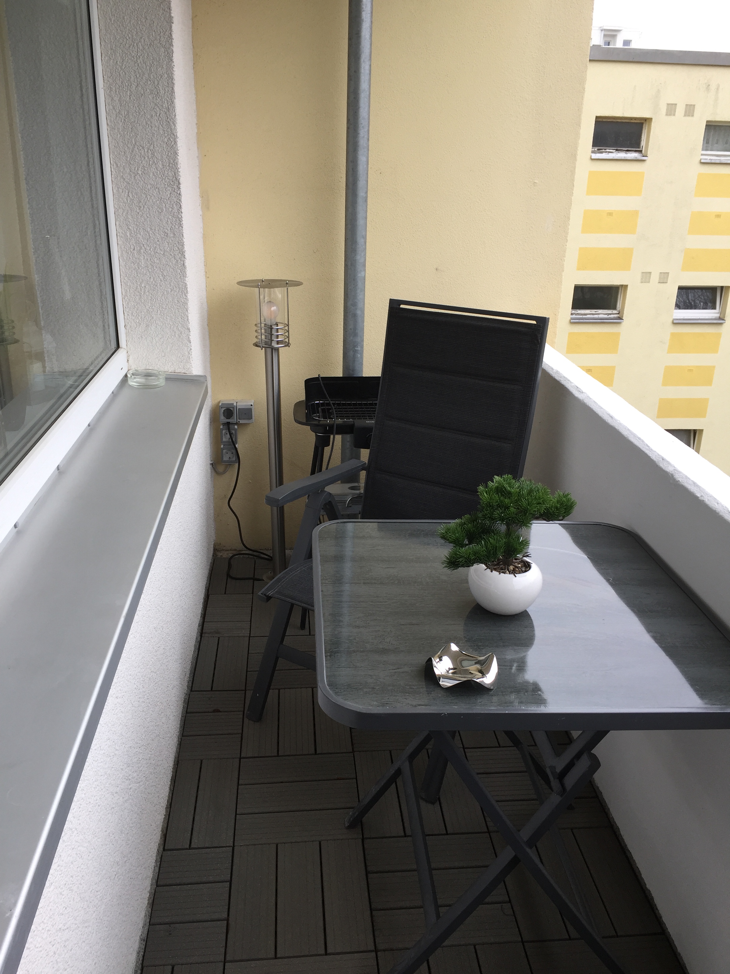 Wäschetrockner u.a. Balkon mit Holzlaminat Balkonmöbeln sowie Beleuchtung nud Elekttrogrill.