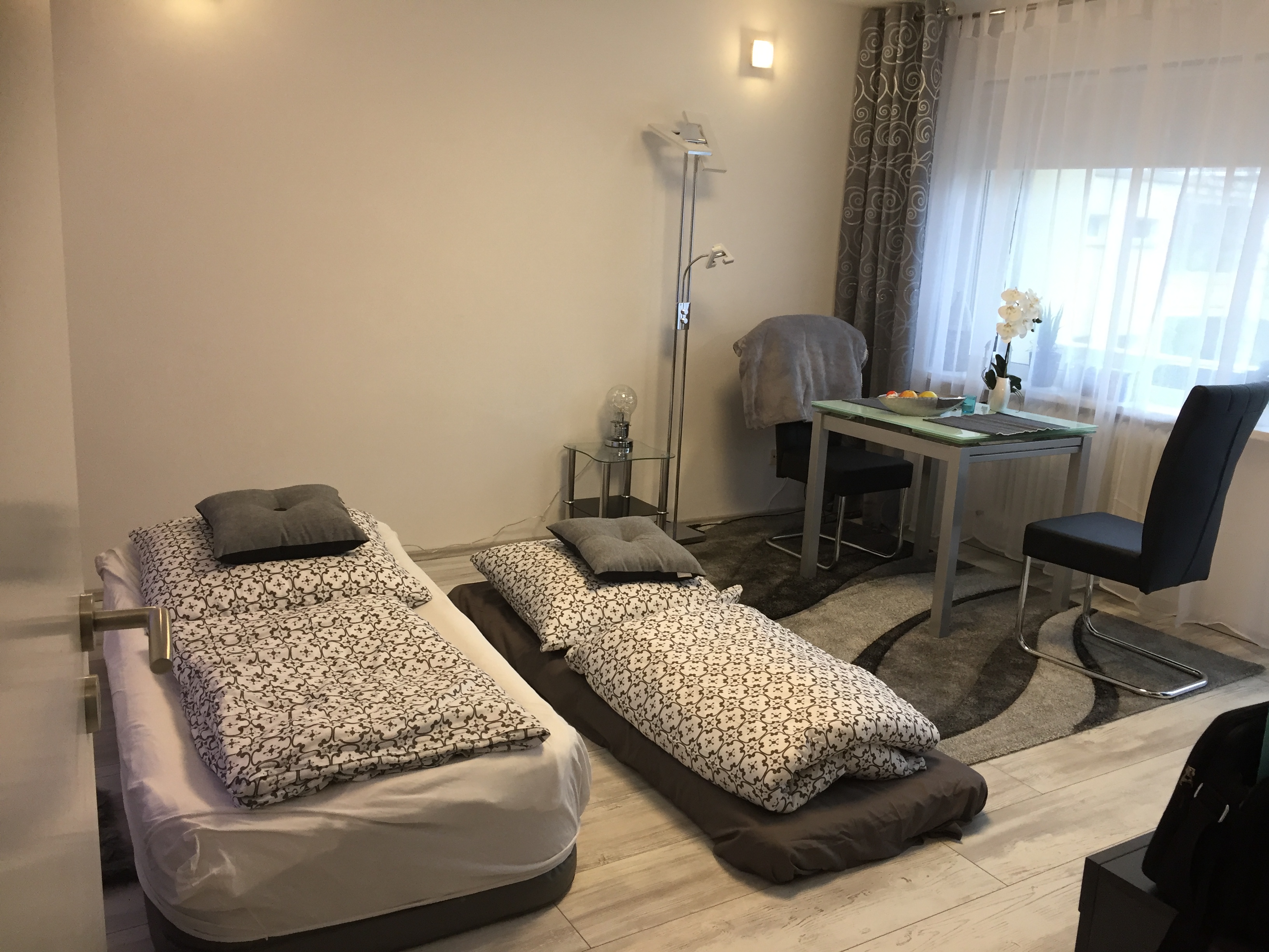 Glastisch mit 2 Stühlen, Kommode, Nachttisch, LCD_TV, Musikanlage, Bügeleisen, Bügelbrett,