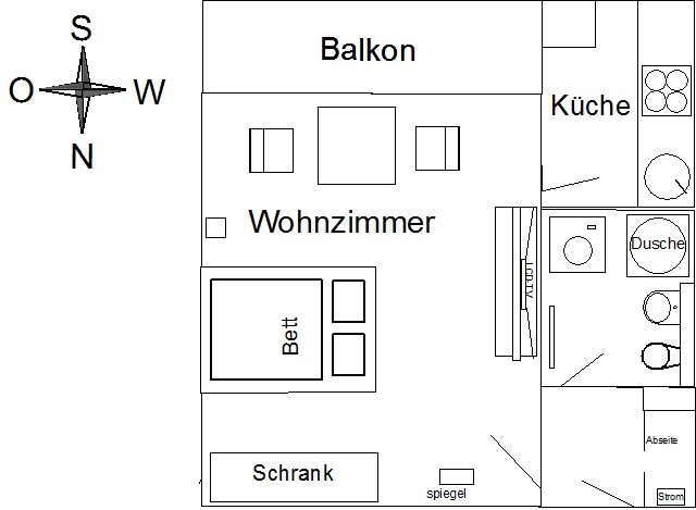 Die Wohnung hat 31 m2 welche sich in Wohnzimmer, Küche, Bad, Flur und Balkon aufteilen, sie befindet sich in der 4.ten Etage